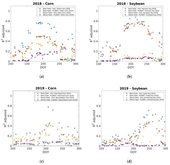 Unlike with WV-3, Planet and HLS provided a dense time series of multi-spectral images, which allowed the determination of R2 optimized timing to correlate satellite-derived features with yields. Figure 9 shows examples of how R2 changes with time for some of the corn and the soybean fields in 2018 and 2019. Results show that, for some fields, a clear peak was visible, and R2 reached values up to 0.8, suggesting possibility to explain up to 80% of within-field yield variability, whereas, for other fields, the maximum seasonal R2 was around 0.1–0.2, suggesting that multi-spectral HLS and Planet data failed to explain within-field yield variability.