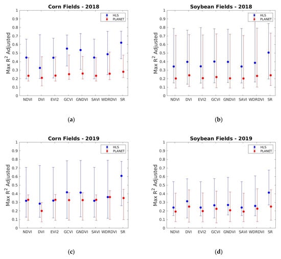 Dependence of the coefficient of determination R2 for the best HLS- and Planet-based models on field yield: (a)–(b) for corn and (c)–(d) for soybean.