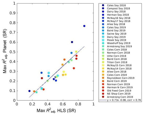R2 values obtained for HLS were higher than those obtained for Planet because of different scales employed (3 m vs. 30 m, or an order of 10 × 10 = 100). Averaging 3 m yield values to the 30 m HLS resolution reduces the variance of yield (Figure 5) that could be explained with satellite data, therefore increasing the coefficient of determination. Overall, a strong correlation between HLS- and Planet-based models was observed (Figure 11), suggesting consistency of results achieved with HLS and Planet data. In other words, the same set of fields gave higher or lower R2 values for both Planet and HLS.