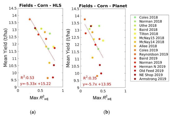 In order to detect the optimal timing of correlating satellite-derived features with corn and soybean yields, a high temporal resolution of satellite data was required. This was achieved through the use of near-daily Planet data and a combination of 3–5 day revisit cycles of Sentinel-2 and Landsat 8 combined []. The maximal correlations for corn and soybean were obtained at 3 and 2–2.5 months, respectively, which is consistent with previous studies utilizing coarse resolution MODIS data and county-level yields []. We observed a very variable performance of these datasets to explain within-field yield variability: coefficient of determination R2 (Equations (3) and (4)) varied from 0.21 to 0.88 (average 0.56 ± 0.19) for 30 m HLS and from 0.09 to 0.77 (0.30 ± 0.16) for 3 m Planet. Obtained R2 values were higher for HLS than Planet because of various scales employed; averaging 3 m yields to 30 m reduced within-field yield variance (Figure 5), therefore potentially benefiting moderate resolution at the expense of details lost. R2 values were also higher for corn than soybean, which is consistent with previous works utilizing remote sensing data and usually showing better performance for corn [,,]. The maximal correlation between satellite-derived features and yields was observed 2–3 months before the harvest, therefore potentially enabling yield forecasts at field scale end of July to mid-August. We also found that performance of the satellite-derived models was better for corn and soybean fields with lower average yields: as the yields increase, R2 values decrease. It means that multi-spectral data saturate over high yields and cannot capture yield variability. Other variables at such 3 to 30 m scale, such as soil moisture and evapotranspiration (ET) [,,], irrigation vs. rainfed, should be considered, as previous studies showed that field-scale yield variability for corn and soybean in the US is mainly attributed to soil differences in the field and the water holding capacity [].
