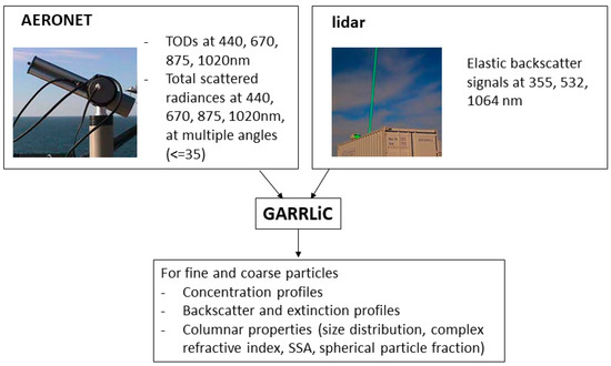 One of examples of such an approach is the Generalized Aerosol Retrieval from Radiometric and Lidar Combination (GARRLiC) retrieval [18] developed as a part of the rather extensive Generalized Retrieval of Atmosphere and Surface Properties (GRASP) algorithm [12,19]: Building on the heritage of the AERONET retrieval, GRASP/GARRLiC can process only passive radiometric and also active lidar observations. Specifically, it can be applied to a combined lidar and sun-photometer measurements and derive both vertically resolved and columnar information about aerosol particles [18]. The detailed capabilities and evolution of GRASP/GARRLiC algorithm is discussed in [20].