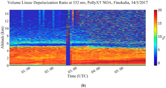 The dust event that took place at Finokalia on 14 May 2017 is shown in Figure 2a presents the total attenuated backscatter coefficient from the lidar measurements at 1064 nm, depicting the vertical extend of the plume that reaches up to 5 km, while there is also a thin layer at 6–7 km. The volume linear depolarization ratio (VLDR) values at 532 nm exceed 15%, which indicates the presence of non-spherical particles from 0.5 up to 5 km. Lower VLDR values below 500 m can be attributed to a possible mixture of dust with marine particles. The AERONET product also indicates the presence of dust particles, with a high aerosol load (AOD ≈ 0.7 at 440 nm) and an Angstrom exponent at 440/870 nm of 0.14, with the latter within the range of the climatological values for desert dust [47].