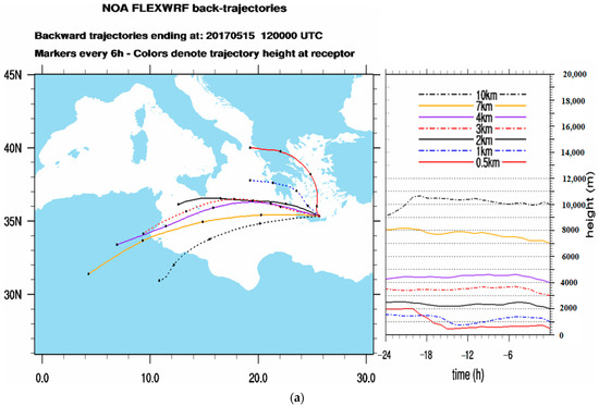 To determine the origin of the particles, we perform back-trajectory analysis using the atmospheric dispersion model FLEXPART-WRF [48]. The 24-h backtrajectories (Figure 3a) show that the air masses arriving at 3 to 10 km above Finokalia, have followed a westerly flow originating from the Sahara region (Tunisia and Algeria), while in the origins for the air-masses arriving below 2 km, sources include the Ionian Sea and the northern part of Greece, suggesting possible contributions from marine and anthropogenic aerosols. The forecast of the NMME-DREAM dust model on 12 May 2017 (Figure 3b) confirms the origin of mineral dust from Algeria and Tunisia and the transport path through the Mediterranean.