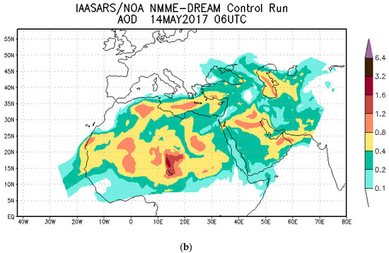 NMME-DREAM is the dust model evaluated in this study. It consists of the meteorological core NCEP-NMME (Nonhydrostatic Mesoscale Model on E-grid) atmospheric model [43]. DREAM [44,45,46] is a numerical model developed to simulate and predict the atmospheric life cycle of mineral dust including dust emission, dust horizontal and vertical turbulent mixing, long-range transport and dust deposition, using an Euler-type nonlinear partial differential equation for dust mass continuity. The model is configured at 0.2° × 0.2° resolution and includes 8 dust size bins with effective radius of 0.15, 0.25, 0.45, 0.78, 1.3, 2.2, 3.8 and 7.1 μm respectively. In the present study, 3 hourly instantaneous model outputs are used.