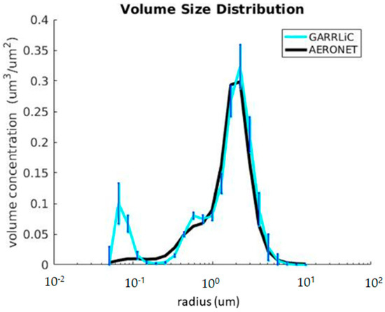 We characterized the dust plume on 14 May 2017 with the GRASP/GARRLiC retrieval, using the lidar measurements at 05:00–06:00 UTC (red box in Figure 2), and the sun-photometer measurements at 05:52 UTC. The AERONET volume size distribution (black line in Figure 4) exhibits a predominant coarse mode, and thus the single-mode inversion (i.e., without retrieving separated values for fine and coarse modes) is performed.