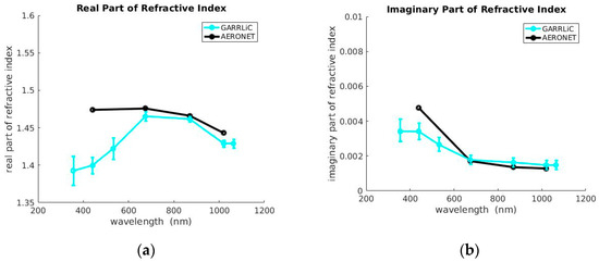 The real part of the refractive index (RRI, Figure 5a) provided by GRASP/GARRLiC agrees well with the AERONET values for wavelengths >670 nm, while for smaller wavelengths the first is much lower than the latter. The range of the RRI is 1.4–1.45, which is at the low end of the climatological values for dust [47]. These values indicate that dust is probably mixed with marine particles, with a typical value for RRI of 1.36, as discussed also in [23]. The same holds true for the values of the imaginary part of refractive index (CRI, Figure 5b), which ranges from 0.003 to 0.002 from the UV to the Near-IR.