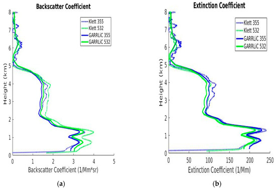 Figure 7 shows the vertical profiles of the particle backscatter and extinction coefficients at 355 and 532 nm retrieved from lidar measurements with the Klett method [50] (blue and green dashed lines for 355 and 532 nm, respectively), and with the GRASP/GARRLiC algorithm (blue and green solid lines for 355 and 532 nm, respectively). For the Klett retrievals, we used a lidar ratio of 67.5 sr and 56 sr at 355 and 532 nm, respectively, so that the integral of the retrieved extinction coefficient profiles closely reproduce the AOD measured by the sun-photometer at 340 and 500 nm. Moreover, we used the glued signals from lidar far-range and near-range receivers. The resulting particle extinction and backscatter coefficient profiles retrieved with the Klett method and GRASP/GARRLiC are found to be in reasonable agreement, with the GRASP/GARRLiC values being slightly smaller, in the order of 3% compared to the values retrieved with the Klett method. These differences may arise from the different assumptions of the profile behavior near the ground for the two methods: GRASP/GARRLiC assumes it to be constant at the lowest 200 m, which is not the case for the Klett method. The GRASP/GARRLiC particle extinction and backscatter coefficient profiles are much smoother due to the reduced resolution of the lidar signals, which is suggested for reducing lidar signal noise levels and the complexity of the retrieval [18].