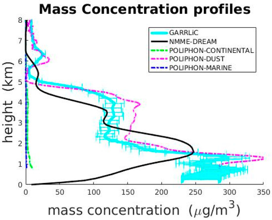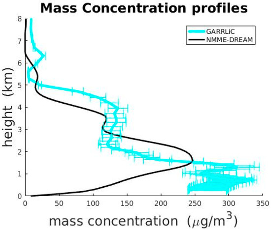 In Figure 8 the aerosol mass concentration profile retrieved with GRASP/GARRLiC (blue line) is compared with the corresponding profile simulated with the NMME-DREAM model (black line). For the conversion of the volume concentration profile provided by GRASP/GARRLiC, to the corresponding mass concentration profile, we consider that all particles have a density of 2.35 g/cm3, which is the mean of the 2.1–2.6 g/cm3 density range provided in the literature for dust [51]. The error bars in the GRASP/GARRLiC mass concentration profile in Figure 8 denote this density range.
