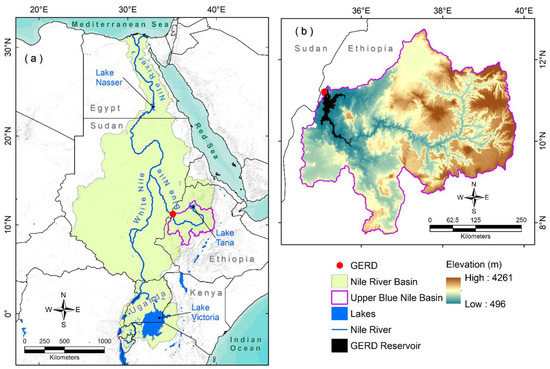 The Nile River stretches from south to north (length: 6853 km) throughout the Nile River Basin (NRB; area: 3.4 × 106 km2) in Northeast Africa. The Nile’s primary tributaries are the White and Blue Niles (Figure 1a). The White Nile flows from Lake Victoria, and then runs through Uganda into Sudan. It meets the Blue Nile (which originates from Lake Tana in Ethiopia; Figure 1b) at the city of Khartoum in Sudan, then flows through Egypt into the Mediterranean Sea (Figure 1a).