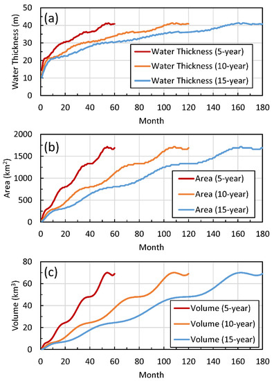 Figure 3 shows temporal variations of the simulated reservoir volume, area, and water thickness based on 5-, 10-, and 15-year filling strategies. Examination of Figure 3 reveals that the larger the filling period, the smaller the monthly water thickness, volume, and surface area of the GERD reservoir. For example, monthly average volumes of 1.17, 0.58, and 0.39 km3 are required to completely fill the GERD reservoir during 5-, 10-, and 15-year scenarios, respectively. In addition, the monthly change of water thickness is estimated to be 0.68, 0.34, and 0.23 m for the 5-, 10-, and 15-year scenarios, respectively. The average monthly changes of the reservoir area are 28.15, 14.10, and 9.38 km2 for the 5-, 10-, and 15-year scenarios, respectively.