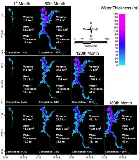 Spatiotemporal variability of the GERD reservoir volume, area, water thickness, and completion percentage for months 1 and 60 in the 5-year filling strategy (top row); months 1, 60, and 120 in the 10-year filling strategy (middle row); and months 1, 60, 120, and 180 in the 15-year filling strategy (bottom row).