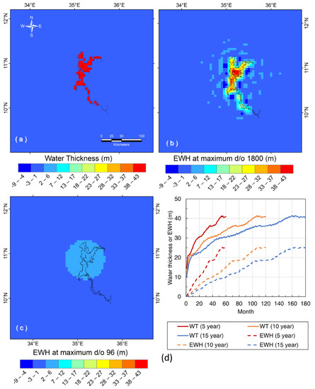 Water thickness and equivalent water height (EWH) for the last month (water thickness: 41 m; area: 1689 km2; volume: 70 km3): (a) Water thickness with a constant value of 41 m inside the GERD reservoir and 0 outside; (b,c) EWH estimates from SHC truncated to a maximum degree/order of 1800 and 96, respectively; and (d) temporal variations of water thickness (WT) and EWH for different filling strategies (5, 10, and 15 years).