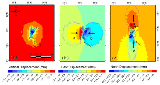 Deformation estimates in (a) vertical, (b) east, and (c) north directions, computed using the final month (water thickness: 41 m; area: 1689 km2; volume: 70 km3) in each filling strategy. The black arrows in Figure 6b,c indicate directions of horizontal motion. Polygons a, b, c, and d represent the projected extent of the west, east, north, and south displacements, respectively. Different color scales are used for different deformation components.