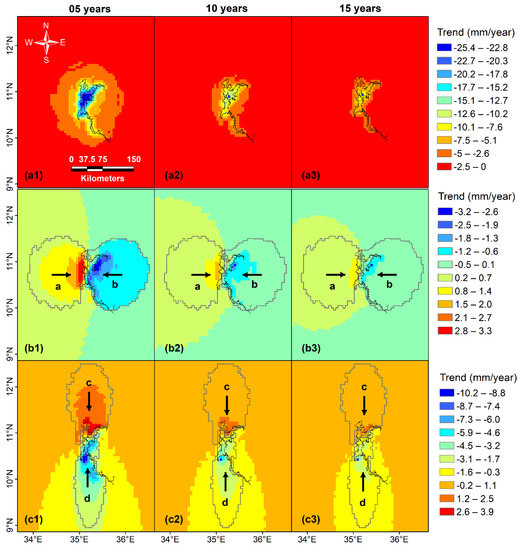 Examination of Figure 7a reveals that the trend in vertical deformation for the 5-year strategy ranges between −0.02 and −25.38 mm/year, with the maximum deformation centered over the middle of the GERD reservoir. Negative trends in vertical deformation indicate land subsidence. The subsidence rates decrease away from the center of the GERD reservoir. The maximum subsidence rates also decrease as the filling period increases (e.g., 10 years: −12.72 mm/year; 15 years: −8.49 mm/year). The average subsidence rates over the entire GERD reservoir for the 5-, 10-, and 15-year filling strategies are −17.79 ± 0.02, −8.90 ± 0.09, and −5.94 ± 0.05 mm/year (Figure 8a). Subsidence rates decrease as the reservoir filling period increases. The hydrostatic pressure generated by a 5-year reservoir with larger monthly volume (1.17 km3), area (28.15 km2), and water thickness (0.68 m) cause a higher displacement rate compared to that of the 10-year (monthly volume, area, water thickness: 0.58 km3, 14.10 km2, 0.34 m) and 15-year (monthly volume, area, water thickness: 0.39 km3, 9.38 km2, 0.23 m) reservoirs.