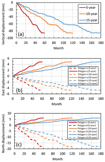 Figure 7 shows the trends (in mm/year) in the vertical, east, and north defamation components for the 5-year, 10-year, and 15-year filling strategies. This figure is generated by fitting a linear trend for each deformation time series, then plotting these linear trend values. Trend errors were calculated using the approach developed by Ahmed and Wiese [6]. Figure 8, however, shows the temporal variability in averaged vertical deformation (Figure 8a), east deformation (Figure 8b), and north deformation (Figure 8c) for each of the three filling strategies. These averages were generated by summing the results of all grid points lying within the GERD reservoir domain (vertical deformation) or within polygons a and b (shown in Figure 7b; east deformation) or polygons c and d (shown in Figure 7c; north deformation).
