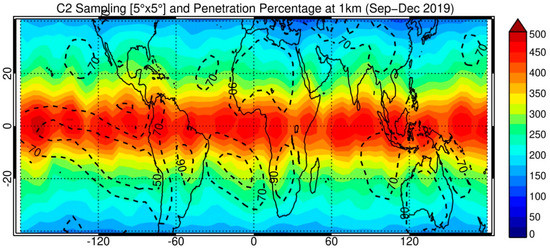 C2 sampling using 5° × 5° grids (color contours) along with penetration percentage to at least 1 km above the surface (dashed contours) from September–December 2019.