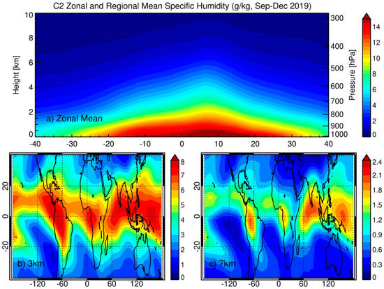 (a) C2 zonal mean specific humidity (g/kg), along with the C2 specific humidity at (b) 3 km and (c) 7 km within 40°N–40°S from September–December 2019.