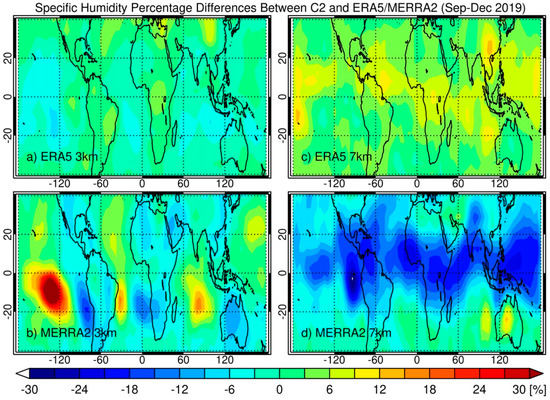 (a,c) C2 and ERA5 specific humidity percentage differences at 3 km and 7 km, and (b,d) C2 and MERRA-2 specific humidity percentage differences at 3 km and 7 km within 40°N–40°S from September–December 2019.