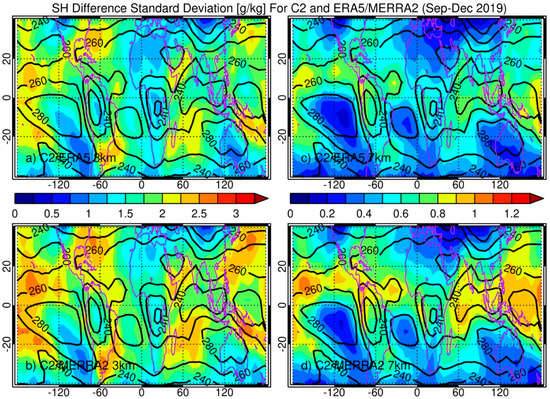 We also explore the relationship between the standard deviation of the SH differences between C2 and reanalysis pairs to the mean outgoing longwave radiation (OLR) from ERA5 throughout the tropics and subtropics in Figure 7. OLR has been used in many past studies as a proxy for deep convection [36,37,38,39] with lower mean OLR values (in W/m2) indicating more frequently occurring deep convection (and vice versa), and we speculate that deep convection may play a role in some of the larger humidity differences observed. At 3 km (Figure 7a,b), standard deviation patterns are comparable for both C2/ERA5 and C2/MERRA-2, although variation is generally larger across all regions for C2/MERRA-2, similar to Rieckh et al. [32]. Except for the eastern Pacific Inter Tropical Convergence Zone (ITCZ) and the South Pacific Convergence Zone (SPCZ), large variability “hotspots” do not match up extremely well with lower OLR regions at 3 km. At this altitude, most hotspots are located along the edges of low OLR regions, such as over the Gulf Stream and Kuroshio currents and over Argentina. However, deep convection occurs in these regions as well [40] and may play a role in the observed variation. At 7 km (Figure 7c,d), OLR matches up extremely well with the standard deviation of SH differences for both C2/ERA5 and C2/MERRA-2. For example, in regions with a higher mean OLR (such as over the stratocumulus cloud regions near the western coasts), standard deviations are at a minimum whereas regions with a low mean OLR (including the ITCZ, Pacific Warm Pool, and the central Indian Ocean) are at a maximum. While it is unclear why agreement is better at 7 km, the relationship between the tropical vertical water column and convection may play a role. Water vapor has much less spatial uniformity than temperature in the tropics and is more locally influenced by evaporation, precipitation, and advection [41], especially in the free troposphere well-above the boundary layer. In the tropics, the boundary layer height can often be near or even above 3 km [42,43] which could limit variability at this height. While OLR and SH difference standard deviation patterns lend support to the idea that larger moisture differences between C2 and the reanalyses can occur due to deep convection, a strong relationship was not observed between transient OLR and profile pair SH differences (not shown). Thus, the influence that deep convection may have on moisture will receive more in-depth study in future research.
