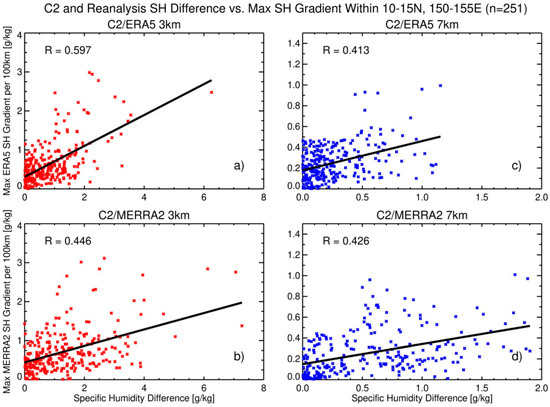 Next, we investigate the relationship between profile pair SH differences and the maximum local reanalysis SH gradients per 100 km near each pair in Figure 9. The profiles are obtained within 10°–15°N and 150°–155°E, which is within the same region shown in Figure 8. The local SH gradient is obtained over a roughly 300 km transect (transect lengths are slightly different due to differing reanalysis resolutions) in all directions, with only the maximum gradient saved for analysis. This transect length was chosen as it is slightly larger than the native horizontal resolution of C2. The observed SH differences are generally larger as humidity gradients become larger at both altitudes and for both ERA5 and MERRA-2. For C2 and ERA5 at 3 km (Figure 9a), a moderate relationship (R = 0.597) is observed between the two variables, as SH differences typically increase as the local humidity gradient becomes larger. The relationship between C2 and MERRA-2 at 3 km (Figure 9b) is a bit milder (R = 0.446) and the spread between points is larger, indicating larger SH differences occurring more often. Similar patterns are also observed at 7 km (Figure 9c,d). Correlation coefficients are almost the same (0.413 and 0.426, respectively) albeit with slightly less obvious trends. Based on the sample size (n = 251), each of these correlation coefficients are significant at the 99% confidence interval. There are some instances where maximum gradients are relatively large and SH differences are small. In these cases, SH differences can be affected by the location of the C2 ray path relative to the gradient (e.g., if both the C2 ray path and the ERA5 profile are on the moist side of the gradient). Additionally, the direction of the C2 ray path relative to the SH gradient was analyzed (not shown). Larger SH differences were more commonly observed when the ray path crossed through the moisture gradient (e.g., Figure 8), although large differences were seen even when the ray path was parallel to the isohumes.