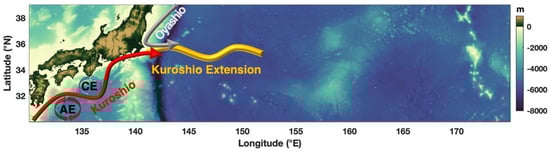 The water depth in the northwestern Pacific Ocean is generally deep, the majority of the region is deeper than 3000 m, and the coastal region that is less than 300 km from the coastline has depths less than 1000 m (Figure 1). There is a submarine ridge, i.e., the Izu-Ogasawara Ridge, that originates from central Japan (35.6° N, 139.7° E) and extends toward the south, where it is associated with a few islands. The largest depth is found immediately east of the ridge, where the depth can reach more than 8000 m. There are two other submarine ridges located to the east, i.e., the Shatsky Rise and the Emperor Seamount. The Kuroshio current and Oyashio current are schematically shown in Figure 1, together with the KE. The meander of the Kuroshio current can induce intense dynamic processes, such as mesoscale eddies, along the main stream of the Kuroshio current [12,25]. Because of the curvature of the Japanese coast and the shallow bathymetry around the Izu-Ogasawara Ridge, the meander and southward meridional flow of the Kuroshio current can induce relatively stable cyclonic and anticyclonic circulation to the south of Japan [40], which are schematically denoted by CE and AE, respectively (Figure 1). The large EKE of the KE can generate a great number of eddies and fronts [36], similar to other western boundary current systems [25]. It is important to point out that the stability of the KE [41] exhibits large interannual variability that is not captured in the figure.