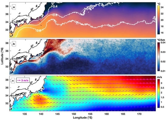 - Kida, S.; Mitsudera, H.; Aoki, S.; Guo, X.; Ito, S.I.; Kobashi, F.; Komori, N.; Kubokawa, A.; Miyama, T.; Morie, R.; et al. Oceanic fronts and jets around Japan: A review. J. Oceanogr. 2015, 71, 469–497. [Google Scholar] [CrossRef]