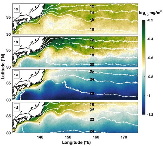 Seasonally averaged Chl-a (log10 (mg/m3)) overlaid with SST (°C). The seasons are (a) winter (January–March), (b) spring (April–June), (c) summer (July–September), and (d) fall (October–December).