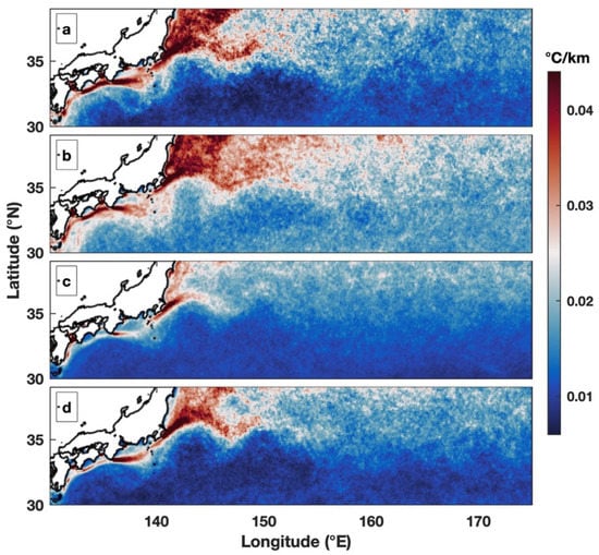 The seasonal variability in the SST gradient is prominent (Figure 4), although the general spatial pattern, e.g., the meridional difference, is consistent with the annual average. The SST gradient is high for the entire region during winter, especially in the northern section along the Oyashio current, and the corresponding peak value can be as high as 0.05 °C/km (Figure 4a). To the south of KE, the value is much lower, e.g., 0.01 °C/km or less. During spring, the SST gradient in the majority of the region reaches an annual maximum, especially around the Oyashio current and along the meander of the Kuroshio current (Figure 4b), which is consistent with the large SST changes during the same period (Figure 3b). In summer, the SST gradient (Figure 4c) generally decreases, especially in the Oyashio current where the value reaches the lowest value throughout the year (Figure 4c). This phenomenon is largely attributed to the warm SST over the entire region (Figure 3c). The SST gradient increases in autumn, acting as the transitional period between summer and winter (Figure 3d).