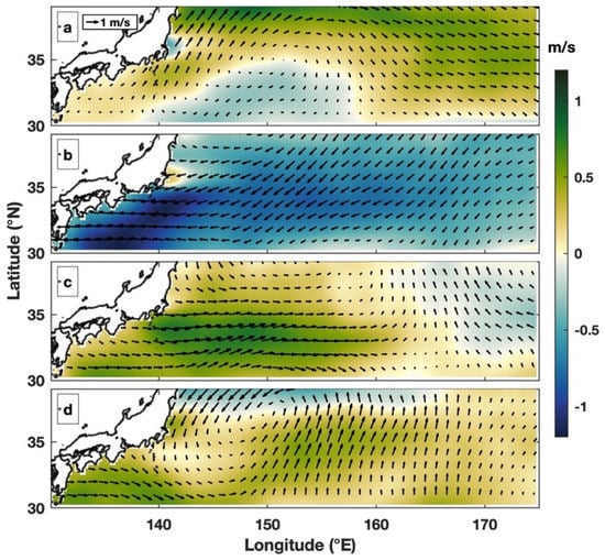 Wind speed also shows a clear seasonal variance after removing the overall average from the seasonal average (Figure 5). During boreal winter, the wind near the coast and in the northern section is intensified toward the northeast and southeast, respectively (Figure 5a). In particular, the wind speed reaches the annual maximum over the Oyashio current and remains highly consistent with the annual average over the Kuroshio current and the majority of the KE. In spring, the wind speed is weakest over the entire region (Figure 5b), especially for the region along the Kuroshio current. Please note that the range of shading and the unity wind vector in Figure 5 differs from that in Figure 2c, and the change in wind is generally weaker than the overall average. Thus, the negative value of wind change can be related to the reduced magnitude and change in direction. The strongest wind can be identified during the summer (Figure 5c), when the wind direction is generally consistent with the overall average but acts to intensify the wind field. This phenomenon is particularly true for the KE, where the wind intensifies the mean wind field, which can be attributed to the warm Kuroshio current (Figure 3c) that reduces the stability of the atmospheric boundary layer and increases the wind fields [16]. The wind pattern in fall shows a cyclonic feature over the entire region east of Japan (Figure 5d), e.g., intensified southeastward wind to the south of Japan, northward component to the east (between 150° E and 160° E) and southwestward wind over the Oyashio current. Similar to other features, the wind in fall also acts as a transitional phase due to the corresponding small magnitude in the wind changes.