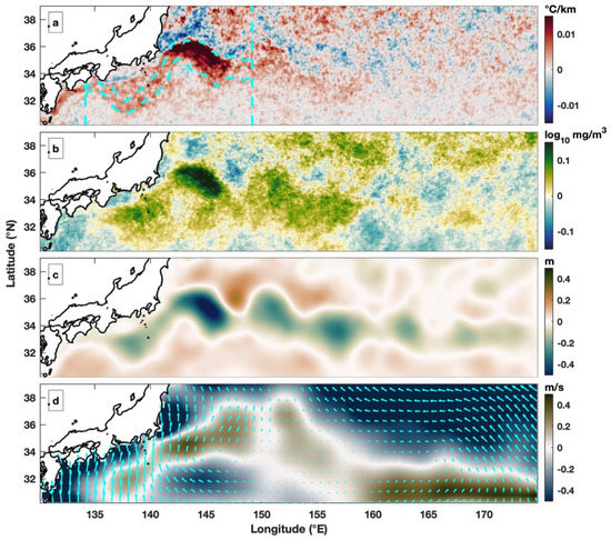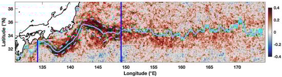 The dynamics influencing the variability of Chl-a are further investigated in an anomalous field, which is obtained using the monthly time series and removing the overall average for the corresponding month, e.g., climatological monthly average. The time series of the Chl-a anomalies and SST gradient anomalies (Figure 6) are positively correlated in the meander of the Kuroshio current and upstream of the KE [8], where the correlation is significant at the 95% confidence level. The confidence level is determined by comparing the correlation with a threshold critical value of 0.28, which is calculated based on the degrees of freedom of the independent observations [15]. Different leads and lags are applied to the time series of the SST gradient and Chl-a data to identify potential lead–lag relationships, and the largest correlation is obtained when both time series are simultaneous. Thus, when the SST gradient anomaly in the main stream of the Kuroshio current and the center of the KE (Figure 1) is large (small), the corresponding Chl-a anomaly is high (low). The region where the variability in Chl-a is related to the SST gradient is precisely delineated in Figure 6, and its boundary in the north–south (east–west) direction is shown as dashed cyan (solid blue) lines. Meridionally, the boundary is defined as the range within one standard deviation of the meridional variation from the center. In its western section, i.e., west of 142° E, the region lies roughly between 100 km and 300 km from the coast, and the coastal area is characterized by a low correlation. In the eastern section, the correlation is especially large within the KE and gradually decreases eastward. It should be noted that the location of the center of the region with the largest correlation in the meridional direction is also identified to the west of 134° E and to the east of 149° E, but the corresponding correlation is not significant.
