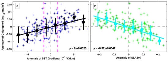 Scatterplots of Chl-a (log10 (mg/m3)) versus (a) SST gradient (°C/km) and (b) SLA (m) in the anomalous field. In (a), black dots are the averaged Chl-a for each bin of the SST gradient, with vertical bars representing the corresponding standard deviation. Similarly, in (b), cyan dots are the averaged Chl-a for each bin of SLA. The solid lines are obtained using linear regression between the values of bins and bin-averaged Chl-a, and both of them are significant at the 95% confidence level. The obtained regression is labeled in the corresponding panel. Dots between the magenta dashed lines in (a) represent small magnitudes of the SST gradient.
