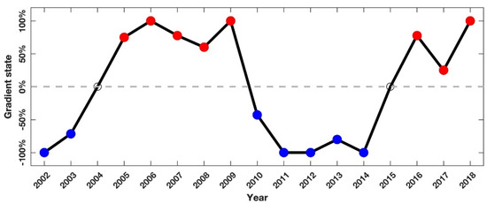 The anomaly of SST gradient magnitude in each month can be classified into one of the three groups depending on its value, e.g., large positive, large negative and the remaining with small magnitude. Then, the ratio between the difference in the number of months with large anomaly values (i.e., the number of months with large positive values minus the number of months with large negative values) and the number of months excluding those with a small magnitude is obtained for each year (Figure 9). Here, a positive (negative) ratio indicates more months characterized by anomalously large (small) SST gradient magnitude within the year. Prominent interannual variability is identified in which a positive (negative) gradient state occurs between 2005 and 2009 and after 2016 (before 2003 and between 2010 and 2014). Only two years, 2004 and 2015, are characterized by a neutral state with the same number of months with anomalously large and small SST gradient magnitudes, or more than 50% of months are characterized as near-zero magnitude of SST gradient anomalies within a year. Thus, the switch between different states occurs in a rapid manner, and each state can be maintained for a few years. Comparing the time series with the previously identified stability of the KE [39], a clear dependence is identified between the stability of the KE and the SST gradient state. A positive (negative) anomaly in the SST gradient magnitude is generally associated with the unstable (stable) mode of the KE, and the gradient state leads by one or two years. Thus, the state of the SST gradient magnitude can be applied as an index to predict the interannual variability in the stability of the KE in the following years.