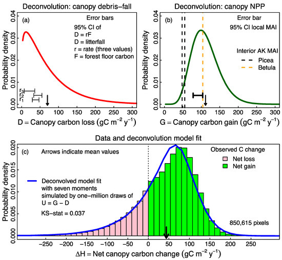 Deconvolution of observed average net change in canopy carbon as unobserved canopy carbon loss (carbon loss through debris-fall) and unobserved canopy carbon gain (carbon gain through above ground Net Primary Productivity; NPP) with a 7-moment fit of their difference (blue distribution) superimposed on the histogram of observed net change in canopy carbon from lidar-assisted carbon model. The fit is poor as expected because the landscape is heterogeneous. (a) Gamma distribution of D interpreted as canopy carbon loss. Error bars show 95% CI of independent estimates of canopy carbon loss using measured decomposition rates of logs in three decay phases (r1: under 30% decomposed, r2: 30-70% decomposed, r3: 70% or more decomposed) [32] and measured coarse woody debris plus litter on the forest floor of the study area. (b) Gamma distribution of G interpreted as canopy carbon gain. Vertical lines give mean annual increment (MAI = stand biomass/stand age) for three Interior Alaska boreal forest sites [33]. Error bar gives 95% CI for MAI = mean [tree biomass/tree age]*(number of trees/plot) averaged over n = 59 plots in the study area. (c) Observed histogram of all pixels giving differences in carbon between two lidar estimates of biomass separated by 13 years with best deconvolved model fit as difference in distributions given in (a) and (b). Pink boxes tally observed pixels with net canopy carbon loss; green boxes tally pixels with net canopy carbon gain. KS-stat = Kolmogrov Smirnoff statistic as described in text indicating a rather poor fit, visible in the figure.