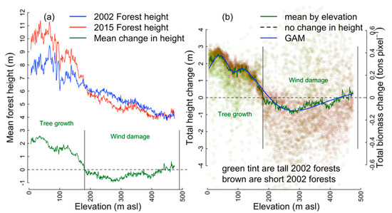 Standing tree height changes from 2002 to 2015 as indicated by differenced canopy height models (13m pixel CHMs). (a) Mean forest height in 13m pixels by elevation in 2002 (blue) and 2015 (red) and their difference (Height change, green, with axis shared with Mean forest height). (b) Total eight change from 2002 to 2015 by elevation and 2002 height. Total biomass change refers to change over 13 years. Tint of points shows mean forest height in 2002 with taller and shorter canopy heights tinted green and brown, respectively. Each point represents a 2002 height by elevation bin with change in height averaged across all pixels in the bin. Blue curve is simple GAM of ~ s(Elevation), where s(·) is the GAM smoother.