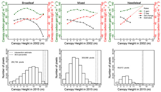 The deconvolution of as the difference of G ~ gamma and D ~ exponential showed that carbon gain rates, G, were maximal at intermediate height for Broadleaf (Ht = 11 m, 134 gC·m−2·y−1) and Mixed (Ht = 9 m, 126 gC·m−2·y−1) vegetation types; only Needleleaf G rate increased monotonically with height class (Figure 3). All three vegetation types increased in G monotonically below 9 m. Mixed forest showed a more constant G above 7 m than Broadleaf growth. Broadleaf G was nearly identical at 3 m canopy (96 gC·m−2·y−1) and 19 m (95 gC·m−2·y−1) heights. Carbon gain rates, D, increased with height class for all three vegetation types (Figure 3), but were relatively constant for Broadleaf forests from 11–17 m.
