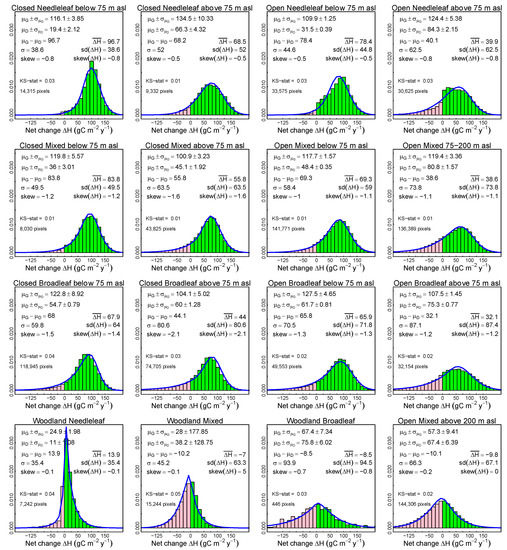 Histograms of observed distributions of net canopy carbon change (green positive, pink negative) with superimposed best fit convolution (blue curve). give means ± standard error of means, and difference of means for canopy NPP = G and canopy debris-fall = D, respectively, with descriptive statistics for printed opposite the corresponding descriptive statistics for from deconvolution so as to make model vs. observation comparison clear. KS-stat is the Kolmogorov–Smirnov test statistic often referred to as “D” in the literature. Pixel count gives sample size in histogram.