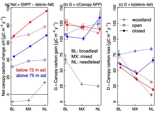 In contrast, canopy NPP as G and debris-fall as D showed evidence of interactions among factors, suggesting that canopy NPP and debris-fall respond in a complex fashion to environmental conditions. A clear interaction effect was presented as elevation:vegetation type on G and D rates (Figure 5b). At Low elevation G for both Open and Closed Broadleaf was greater than for Needleleaf, while at High elevation the reverse held: G for both Open and Closed Needleleaf was greater than for Broadleaf.