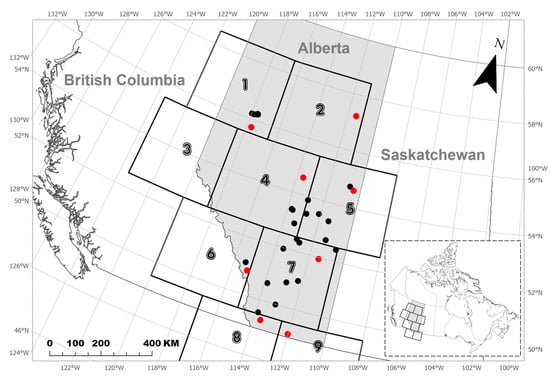 Map for the test region. There are 32 unconfined or semi-unconfined groundwater monitoring wells (dots) in the 9 mascons (numbered from 1 to 9) over the study region located in the province of Alberta, Canada.