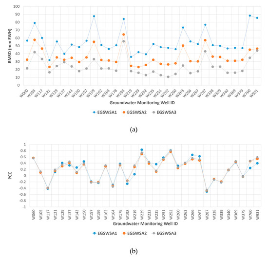 Comparison of the root mean square difference (RMSD) (a) and of the Pearson’s Correlation Coefficients (PCC) (b) in the temporal domain of the selected 32 groundwater monitoring wells in the province of Alberta, Canada. The RMSD and PCC are calculated by comparing the three GRACE derived EGSWSA time series EGSWSA1, EGSWSA2 and EGSWSA3 against the OGWSA time series derived from the GMW observations. The unit of the RMSD (a) is mm EWH. GRACE, Gravity Recovery and Climate Experiment; EGSWSA, Estimated Groundwater Storage Anomaly; OGWSA, Observed Groundwater Storage Anomaly; EWH, Equivalent Water Height.