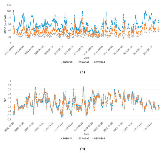 Figure 4 shows comparison plots of the RMSD (a) and the PCC (b) along the GRACE observation time domain from 5 April to 31 December 2016. It is clear that the EGSWSA3 derived from the spatiotemporal downscaling give smaller RMSD for almost all the time epochs than the EGSWSA1 and EGSWSA2. This result demonstrated that the SPTD TWSA is better than the SD TWSA while the SD TWSA is better than the original GRACE TWSA. From this point view, the suggested downscaling processes made a sense.