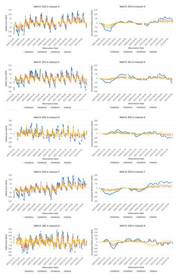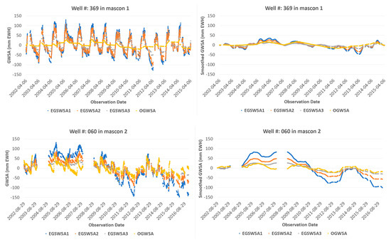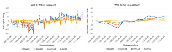From Figure 6, we can see that the variation ranges of three unfiltered EGSWSAs are much bigger than the OGWSA. Their amplitude of individual observation looks not comparable. The reasons for the big differences may be multifaceted. As mentioned in Section 4.3, it might be caused by inaccurate specific yield used to convert the GMW level height changes to OGWSA or possible simulation errors in the input EALCO TWSA or significant seasonal SWSA caused by something such as floods, etc. This is why it is still not practical to compare the amplitudes of the EGSWSA and the OGWSA qualitatively for the model evaluation. However, if we compare their long-term trend changes, the EGSWSA3 shows a better trend change agreement than the EGSWSA1 and EGSWSA2 for all selected GMWs except for very few GMWs, especially after deseasonalizing by the 1-year (365 days) moving average filter. This conclusion is valid for most of the 32 GMWs. Only a few of the GMWs showed some reversed results. An exception among the 8 GMWs is the well W229 in mascon 7, which shows that the EGSWSA2 is closer to the OGWSA. The well W287 and W117, which show negative correlations in Figure 3, have similar results. The reason for this result is not clear yet. Possibly, these exceptional wells have a different specific yield from others or its OGWSA may not adequately represent either the groundwater response or the EGSWSA because of unknown aquifer settings and human activities such as withdrawal, injection, mining, etc.
