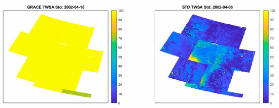 Figure 7 shows that the uncertainties of the SPTD TWSA estimated by the SCVCM are usually improved for the most times and the most parts in the test region in comparison to the a priori input uncertainties of the original GRACE TWSA. This result indicates that the GRACE TWSA and the EALCO TWSA fit each other well for the most times and the most parts in the test region and the proposed method is beneficial to reduce the uncertainties. From Figure 7, we can also see that the uncertainties of the SPTD TWSA are enlarged sometimes at some parts to a significant extent. For instance, in May and June of 2006, the estimated uncertainties for the region of mascon 6 are significantly larger than the a priori input uncertainties of the GRACE TWSA. This indicates very possibly that there are significant differences between the GRACE TWSA and the EACLCO TWSA input data during that period in the area in question. Further analysis and quality control are needed to improve the quality of the model outputs. Similar pattern changes or improvement variations of the estimated uncertainties appear not only spatially but also temporally. These results demonstrated well the role of the SCVCM as a quality control and analysis tool for the LSM EALCO TWS simulation and GRACE observations.