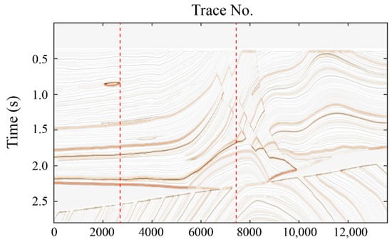 Marmousi2 P-wave velocity model [43] is an open and generally representative model in the field of geophysics, which has complex stratigraphic structures. The Marmousi2 model is firstly used to validate the proposed method. We calculate reflectivity of this model by using the difference of impedance between two layers, such as the reflectivity of the ith interface of being , herein, is the acoustic impedance of the ith layer, and are the density and p-wave velocity of the layer, respectively. Seismic data is generated by convoluting the reflectivity with zero-phase Ricker wavelet of 30Hz as shown in Figure 3, in which the abnormal area on the top-left side represents the gas charged sand channel, while the sharp edges and complicated curved interfaces exist on the right side of the profile. The synthetic seismic profile has 13,601 traces with 2800 time points. We choose 101 evenly-spaced traces from the seismic and impedance profile as labeled data denoted by ( = 101), which is less than 1% of the total traces. For the rest 13,500 traces, we randomly select 10% (1350 sample pairs) as (= 1350) and 90% seismic traces as (= 12,150).