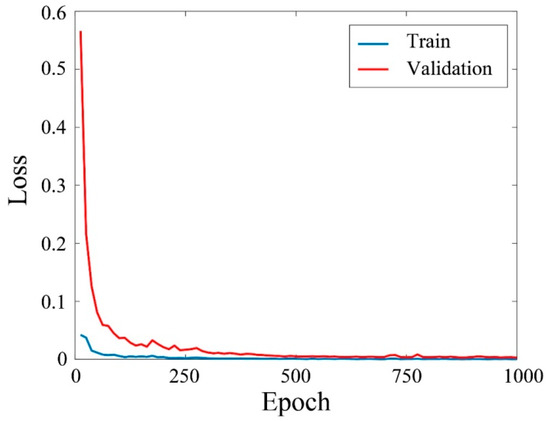 In our framework, we first train the forward model on to synthesize seismic traces from impedance. Then, we freeze the forward model after 1000 epochs training as the network converges in 1000 epochs and we obtain when the validation loss is minimal. The training and validation convergence curves is illustrated in Figure 4. Subsequently, we train and to minimize and in Equations (2) and (4) for 1000 epochs. After the entire training procedure, the generator is utilized to predict impedance from seismic data. To show the performance of the proposed method compared to conventional deep learning inversion methods in the case of limited labeled data, we choose a conventional CNN method as baseline. The CNN has the same architecture as that of the generator as well as forward model and it is trained with supervised learning on to minimize the MSE between the predicted impedance and labels. The training details of CNN and the forward model are exactly the same.
