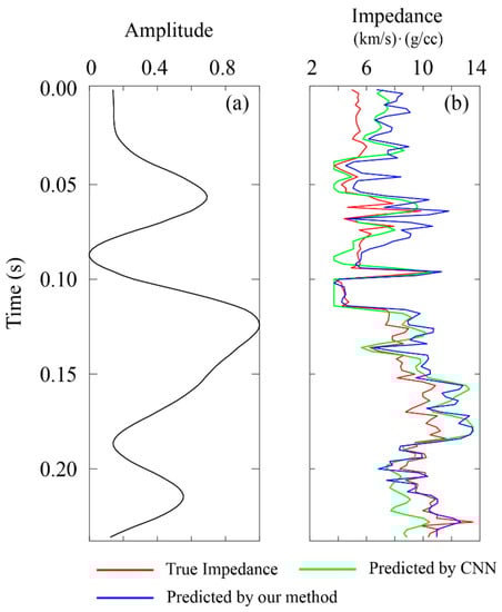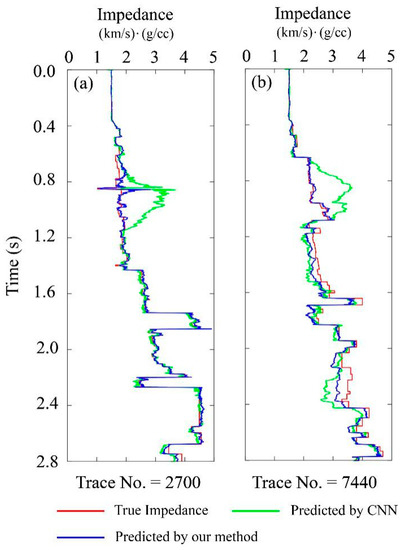 In addition, the impedance of Marmousi2 model around the area of the gas charged sand channel and complex structure marked by the red arrows in Figure 5 are more difficult to be estimated. The prediction of impedance from those areas are challenging for the conventional CNN method due to the lack of labeled training data. We choose two highly representative traces with Trace No. 2700 and 7440, which belong to , to show the performance of our method by comparing with the result of CNN as illustrated in Figure 6. Figure 6a,b show the variations of impedance with respect to time for the Trace No. 2700 and Trace No. 7440, respectively. The red line, green line and blue line respectively refer to the true impedance, impedance predicted by CNN and the proposed method. The Trace No. 2700 is next to the right border of the channel, where a sudden transition of impedance occurs, while the Trace No. 7440 passes through most layers of the profile incorporating complicated structures such as sharp edges. Figure 6 indicates that the impedance predicted by our method basically matches well with the true values of impedance for both traces. The prediction of CNN largely deviates from the true impedance at the time range of 0.7 s to 1.2 s for Trace No. 2700 and the time after 0.7 s for the Trace No. 7440. It is noted that the large deviation from CNN respectively occurs at the area of the gas charged sand channel for Trace No. 2700 and the appearance of sharp edges for Trace No. 7440. The PCC of the proposed method on Trace No. 2700 and No. 7440 are 0.9970 and 0.9880, respectively, while those of CNN method are 0.9384 and 0.8855 respectively. Hence, the proposed method predicts more accurate impedance than that of the conventional CNN. The improvement of our method is mainly contributed by the utilization of the unlabeled data during training.