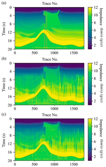 Predicted impedance and true impedance of SEAM model: (a) true impedance; (b) impedance predicted CNN method; (c) impedance predicted by proposed method.
