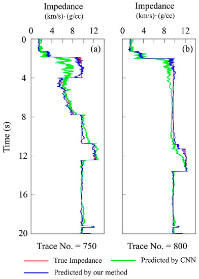 In order to demonstrate the effectiveness of the proposed method in the complicated SEAM model, we select two representative traces such as Trace No. 750 and Trace No. 800 as marked with red dashed line in Figure 7a to clearly show the details of prediction. Trace No. 750 is located in the most complex part of the SEAM model, which passes through the low-velocity zone between layers with high velocities and the deeper layer of Trace No. 750 is incorporated with rugged salt interfaces. Trace No. 800 is located in the relatively simple area of the model, which pass the whole area of the salt body. Figure 8a,b illustrates the variations of impedance prediction of CNN method (green line) and the proposed method (blue line) with respect to time for the Trace No. 750 and Trace No. 800 and the true impedance (red line) is also shown in those figures for comparison. The PCC of the proposed method on Trace No. 750 and No. 800 are 0.9948 and 0.9977, respectively, while those of CNN method are 0.9256 and 0.9834 respectively. Figure 8 clearly indicates that the impedance predicated with the presented method matches well with the true values through the whole shallow to deeper layers. Especially, the prediction of our method at the low-velocity zone for the Trace No. 750 displays a consistent result with true impedance. These detailed results further prove the performance of our method.