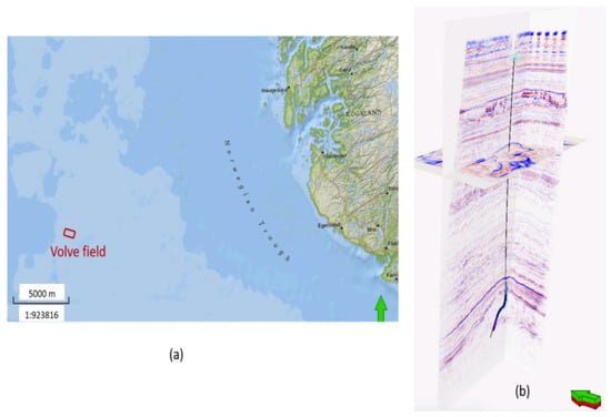 (a) Volve field shown in map located in offshore North Sea, (b) Seismic data along with a well trajectory from the Volve field (Figures are from [25]).