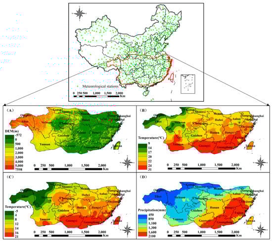 Meteorological data for the study area from 2001 to 2018, including the daily maximum temperature, daily minimum temperature and daily precipitation, were obtained from the land surface daily meteorological data from relevant provinces and cities provided by the National Meteorological Center of the China Meteorological Administration (http://data.cma.cn/ (accessed on 29 January 2021)). There are 824 meteorological stations in China (Figure 1). Firstly, we used the inverse distance weighted method with a spatial resolution of 500 m × 500 m to interpolate these meteorological data among the 824 meteorological stations, so as to match MODIS NDVI. Secondly, the temperature was corrected using Digital Elevation Model (DEM) data and assumed to decrease at a lapse rate of 6.5 °C km−1 []. Then, the values of the annual meteorological factors were calculated based on the averages or sums of the daily meteorological data. Finally, the spatial distribution of the meteorological data in the subtropical region was obtained by clipping, as shown in Figure 1B–D.