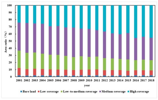 The areal ratios of the FVC high-coverage zone, medium-coverage zone, low-to-medium-coverage zone, low-coverage zone, and bare-land zone from 2001 to 2018 in the subtropical region are shown in Figure 3; combining Figure 3 with Figure 2 highlights that the temporal and spatial evolution characteristics of the FVC levels were significantly different, as follows: